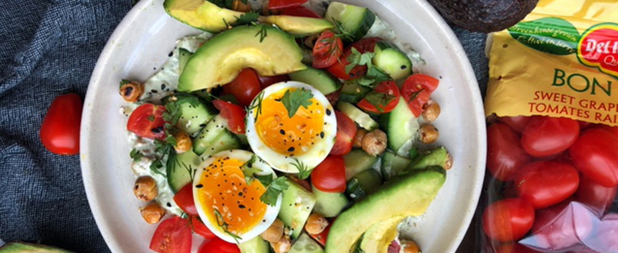 Salade au concombre et aux tomates accompagnées d’œufs mollets et un Tzatziki à l’avocat