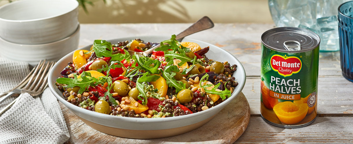 Salade van Puy-linzen, puntpaprika en perzik met peterseliepesto