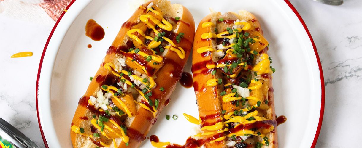 Hot Dogs with Grilled Mango, BBQ Sauce, Lime Pickled Onion, Yellow Mustard