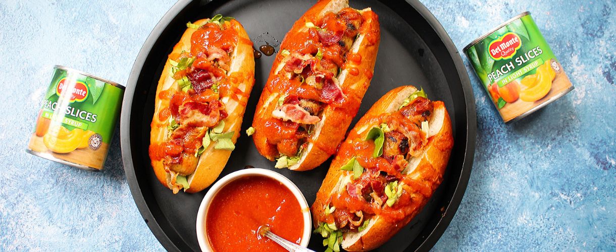 Hot Dogs with Crispy Bacon, Spicy Peach BBQ Sauce, Shredded Lettuce